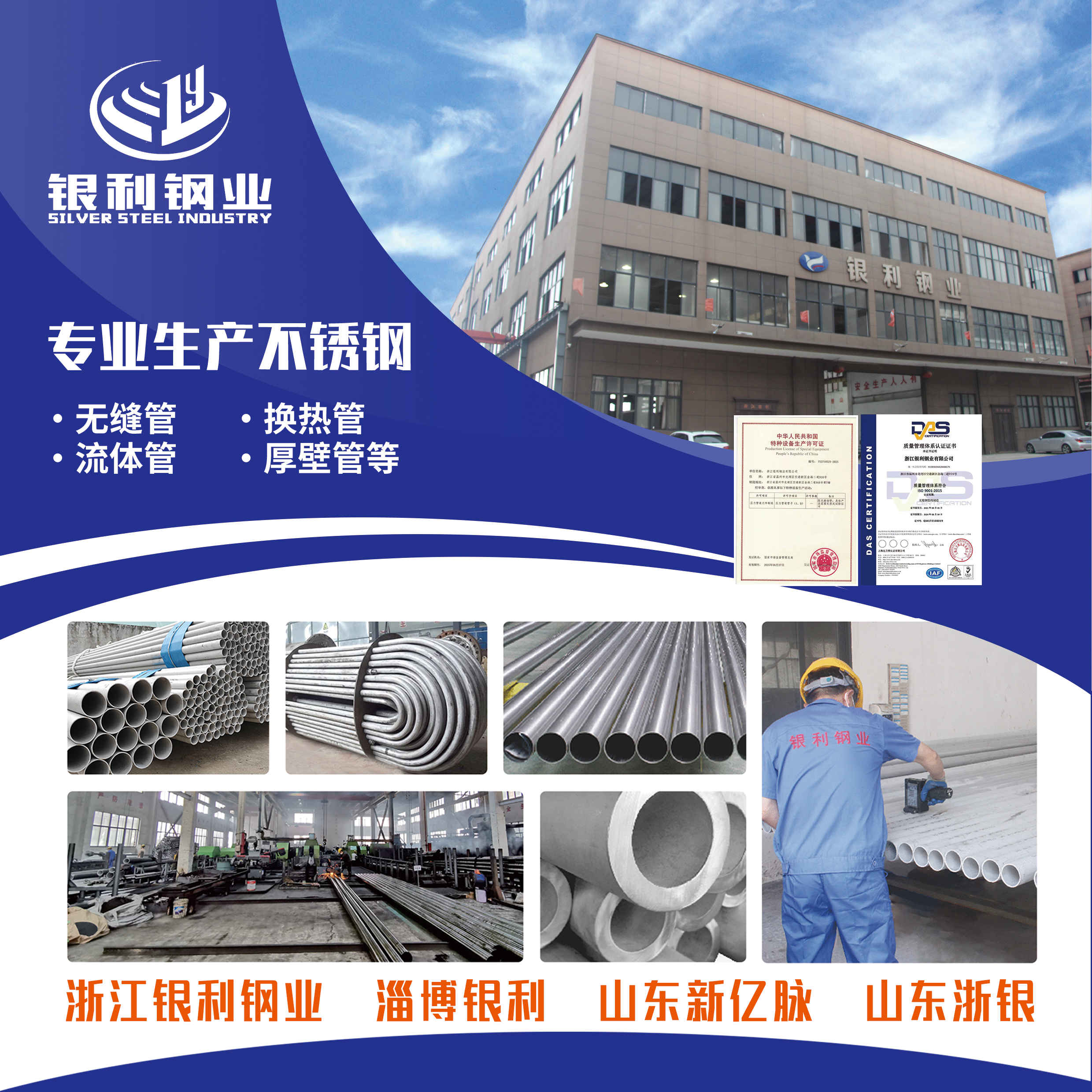 浙江銀利鋼業(yè)有限公司位于溫州市龍灣區(qū)空港新區(qū)金海二道916號,是一家專業(yè)生產(chǎn)、加工、銷售各類不銹鋼無縫鋼管的綜合性生產(chǎn)企業(yè)。已通過特種設(shè)備生產(chǎn)許可證:TS271052Y-2025;主要生產(chǎn)的產(chǎn)品有:TP304、TP316、304L、321、310S不銹鋼管等多種材質(zhì),規(guī)格齊全(可按客戶要求定做),竭誠歡迎各界朋友前來洽談合作。