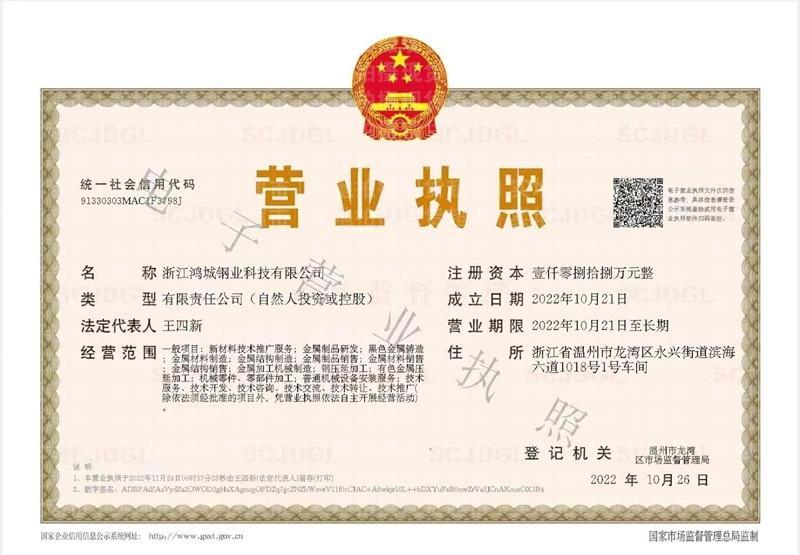 | 企業名稱 | 浙江鴻城鋼業科技有限公司 | 統一社會信用代碼 | 91330303MAC1F3798J |