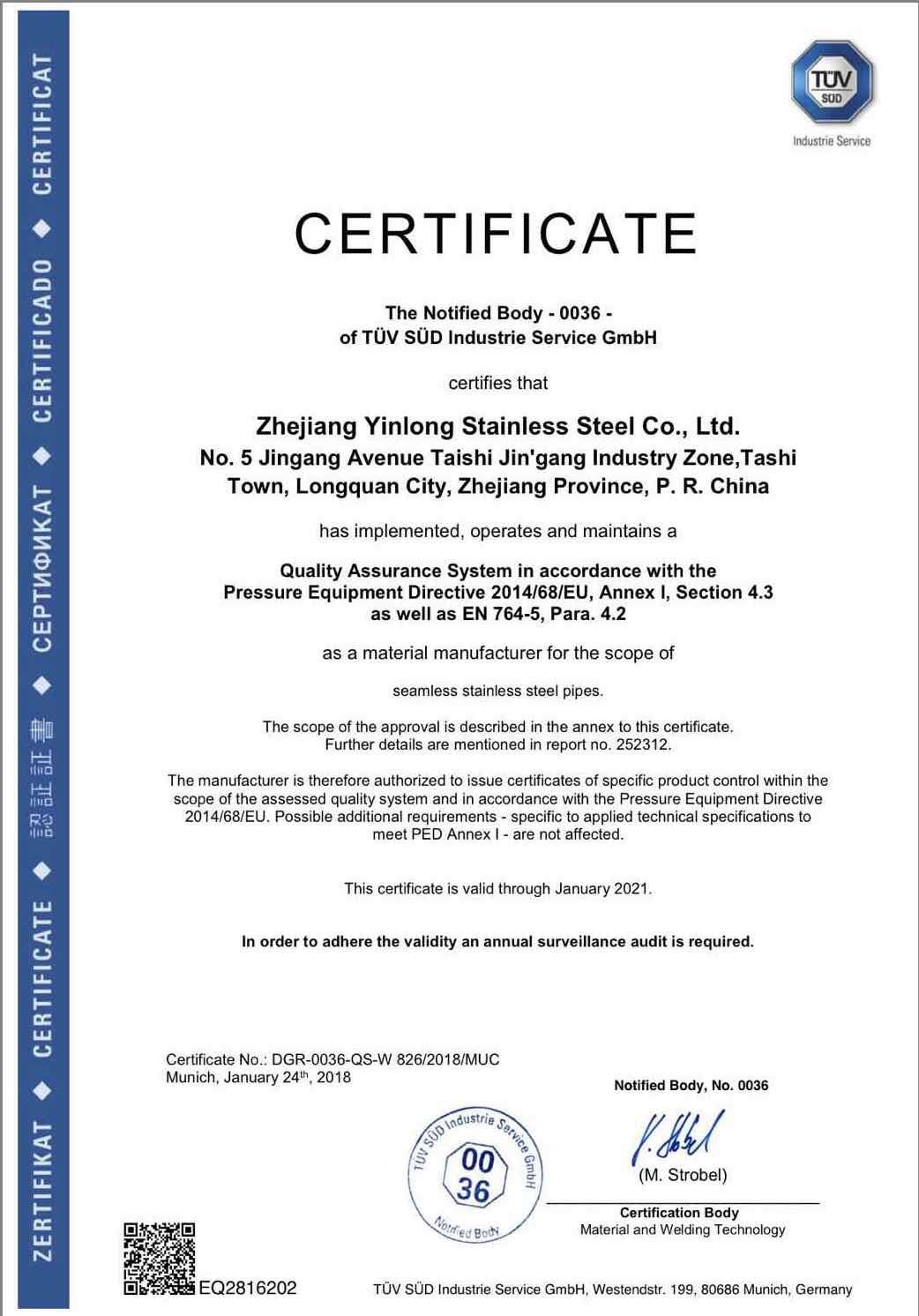 恭賀浙江銀隆不銹鋼榮獲TUV認證的壓力管道生產許可證PED |