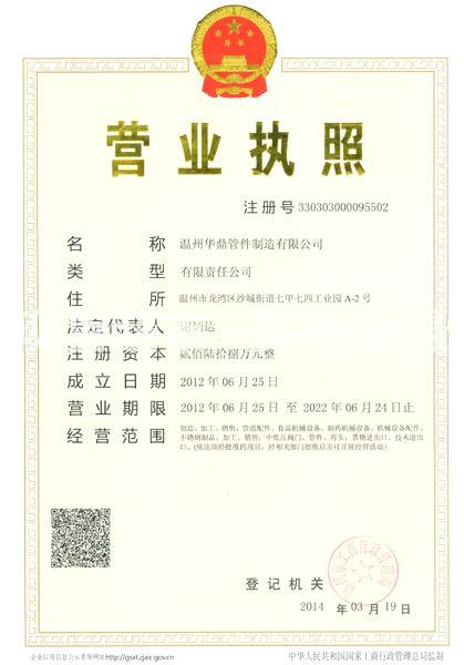 • 溫州華鼎管件制造有限公司,華鼎壓力管道元件正本