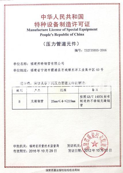 • 福建邦特鋼管有限公司,特種設(shè)備許可證
