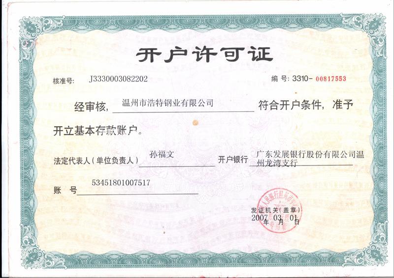 • 溫州市浩特鋼業有限公司,開戶許可證